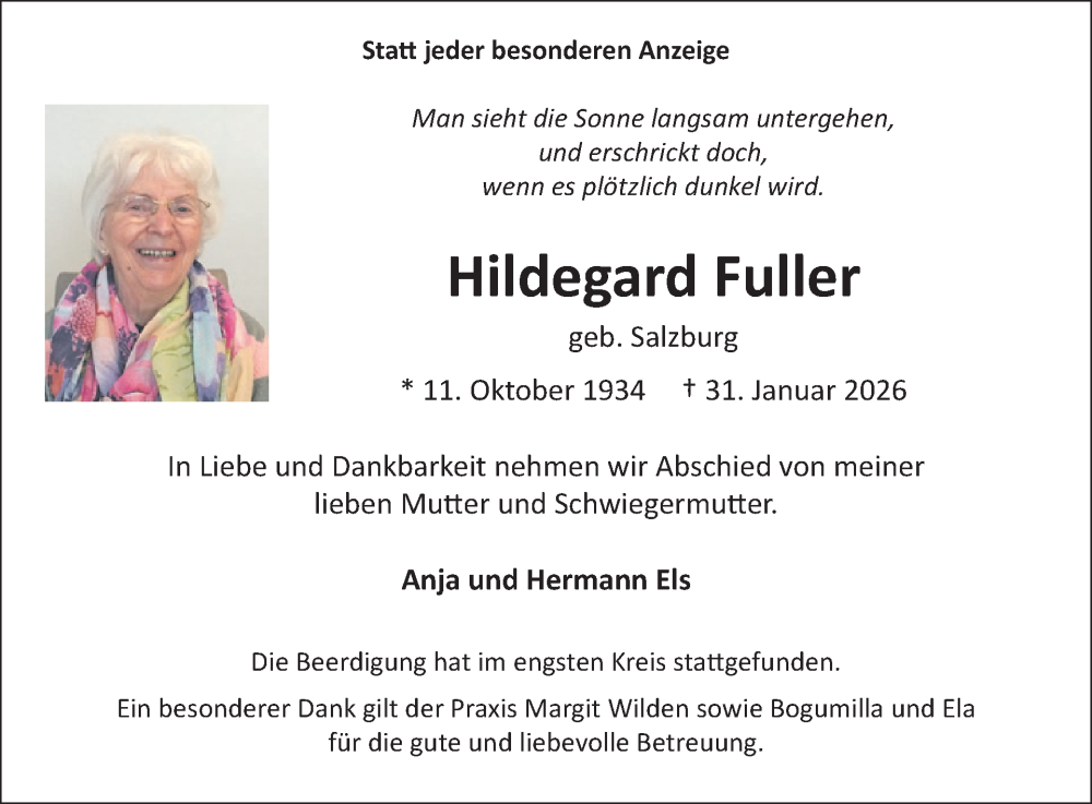 Hier finden Sie alle Traueranzeigen aus der Zeitung, die bisher für Hildegard Fuller erschienen sind. Weitere Traueranzeigen, die in der Zeitung erscheinen, werden hier ebenfalls aufgelistet