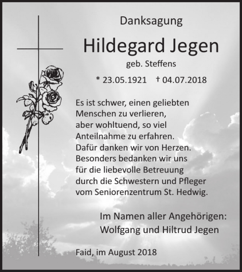 Hier finden Sie alle Traueranzeigen aus der Zeitung, die bisher für Hildegard Jegen erschienen sind. Weitere Traueranzeigen, die in der Zeitung erscheinen, werden hier ebenfalls aufgelistet