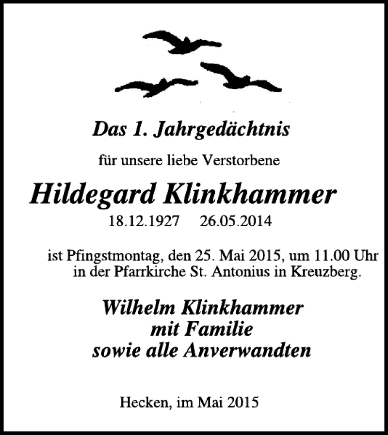 Hier finden Sie alle Traueranzeigen aus der Zeitung, die bisher für Hildegard Klinkhammer erschienen sind. Weitere Traueranzeigen, die in der Zeitung erscheinen, werden hier ebenfalls aufgelistet