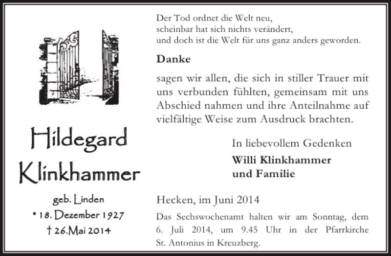 Hier finden Sie alle Traueranzeigen aus der Zeitung, die bisher für Hildegard Klinkhammer erschienen sind. Weitere Traueranzeigen, die in der Zeitung erscheinen, werden hier ebenfalls aufgelistet
