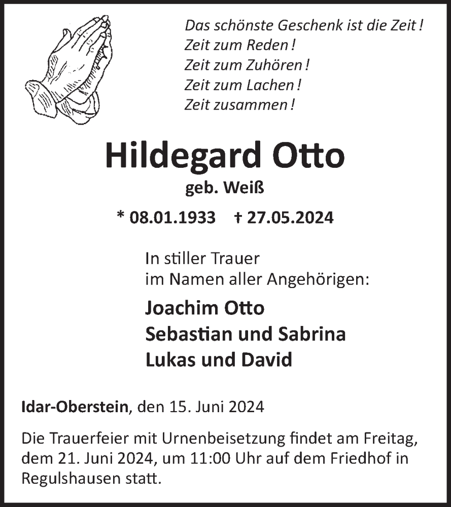 Hier finden Sie alle Traueranzeigen aus der Zeitung, die bisher für Hildegard Otto erschienen sind. Weitere Traueranzeigen, die in der Zeitung erscheinen, werden hier ebenfalls aufgelistet