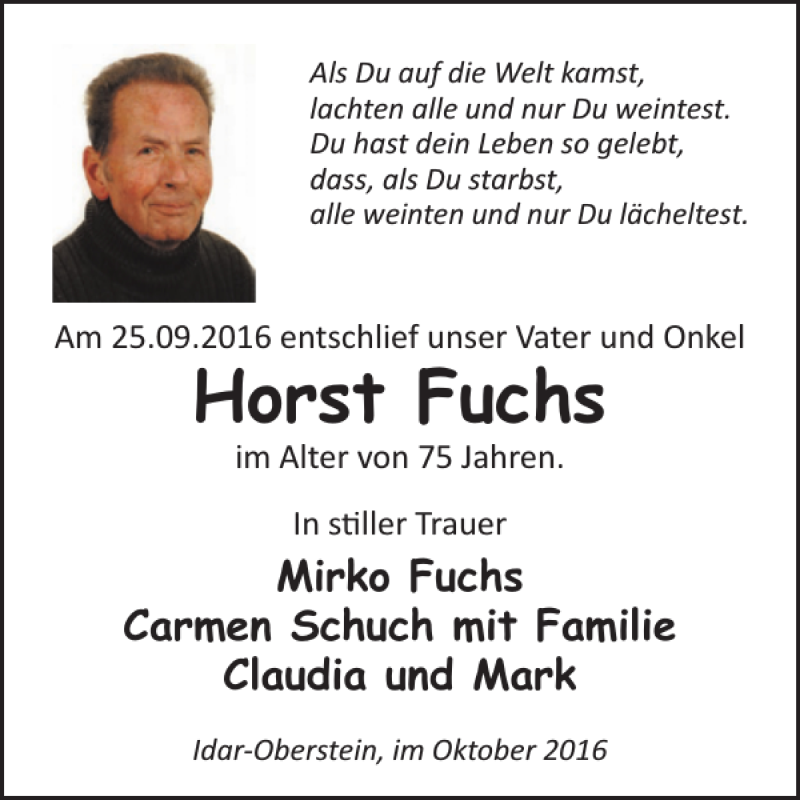 Hier finden Sie alle Traueranzeigen aus der Zeitung, die bisher für Horst Fuchs erschienen sind. Weitere Traueranzeigen, die in der Zeitung erscheinen, werden hier ebenfalls aufgelistet