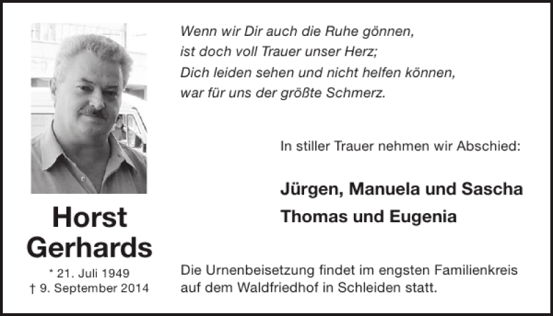 Hier finden Sie alle Traueranzeigen aus der Zeitung, die bisher für Horst Gerhards erschienen sind. Weitere Traueranzeigen, die in der Zeitung erscheinen, werden hier ebenfalls aufgelistet