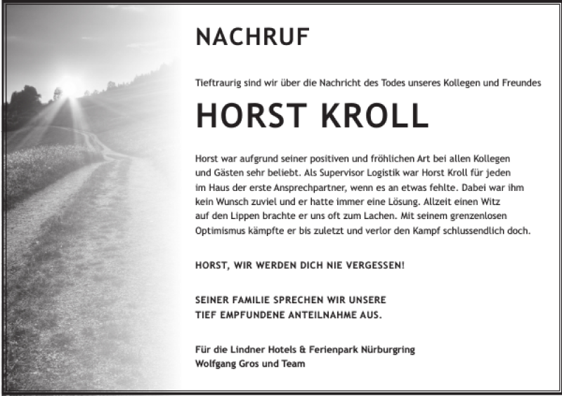 Hier finden Sie alle Traueranzeigen aus der Zeitung, die bisher für HORST KROLL erschienen sind. Weitere Traueranzeigen, die in der Zeitung erscheinen, werden hier ebenfalls aufgelistet