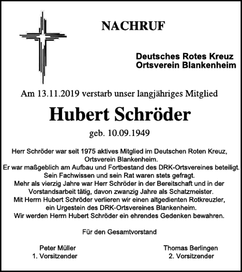 Hier finden Sie alle Traueranzeigen aus der Zeitung, die bisher für Hubert Schröder erschienen sind. Weitere Traueranzeigen, die in der Zeitung erscheinen, werden hier ebenfalls aufgelistet