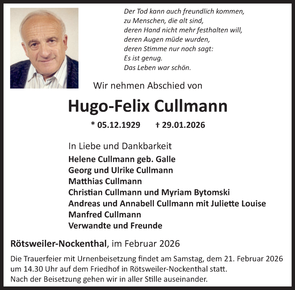 Hier finden Sie alle Traueranzeigen aus der Zeitung, die bisher für Hugo-Felix Cullmann erschienen sind. Weitere Traueranzeigen, die in der Zeitung erscheinen, werden hier ebenfalls aufgelistet