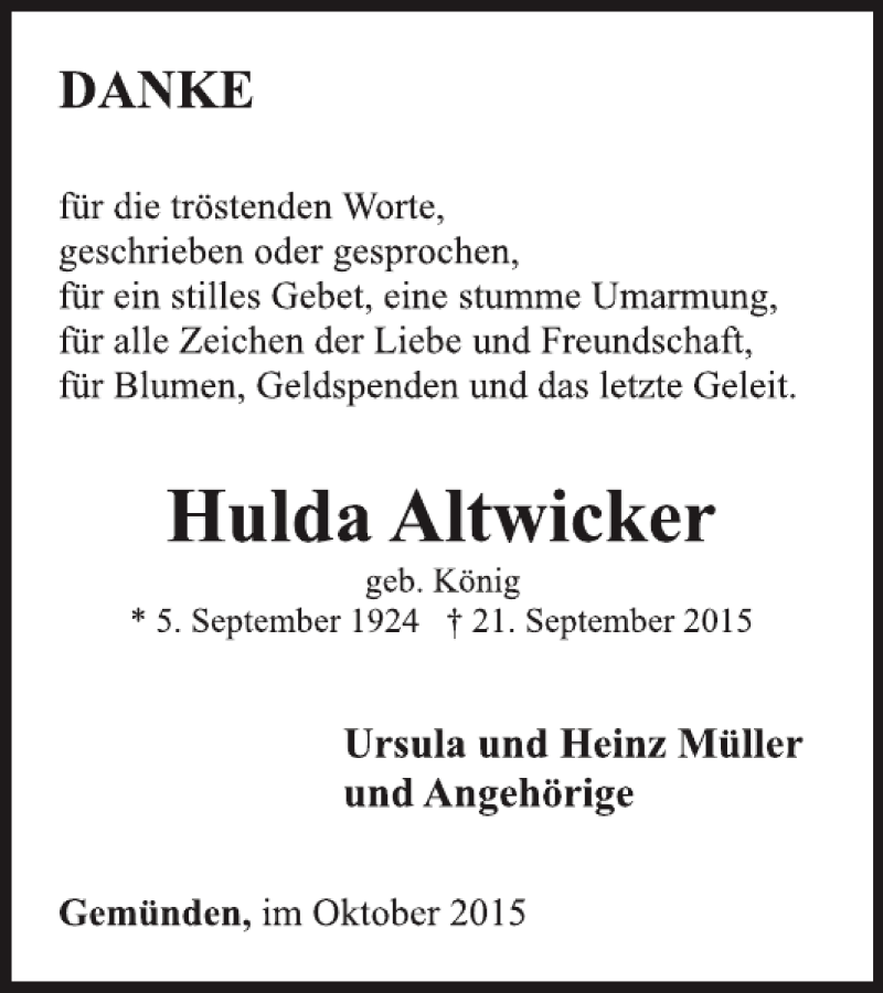 Hier finden Sie alle Traueranzeigen aus der Zeitung, die bisher für Hulda Altwicker erschienen sind. Weitere Traueranzeigen, die in der Zeitung erscheinen, werden hier ebenfalls aufgelistet