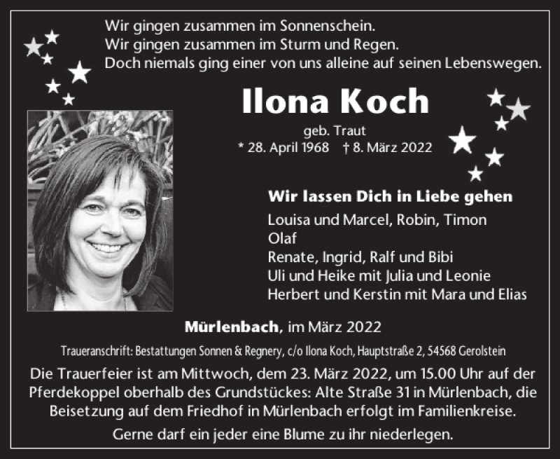Hier finden Sie alle Traueranzeigen aus der Zeitung, die bisher für Ilona Koch erschienen sind. Weitere Traueranzeigen, die in der Zeitung erscheinen, werden hier ebenfalls aufgelistet