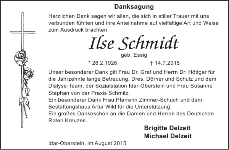 Hier finden Sie alle Traueranzeigen aus der Zeitung, die bisher für Ilse Schmidt erschienen sind. Weitere Traueranzeigen, die in der Zeitung erscheinen, werden hier ebenfalls aufgelistet