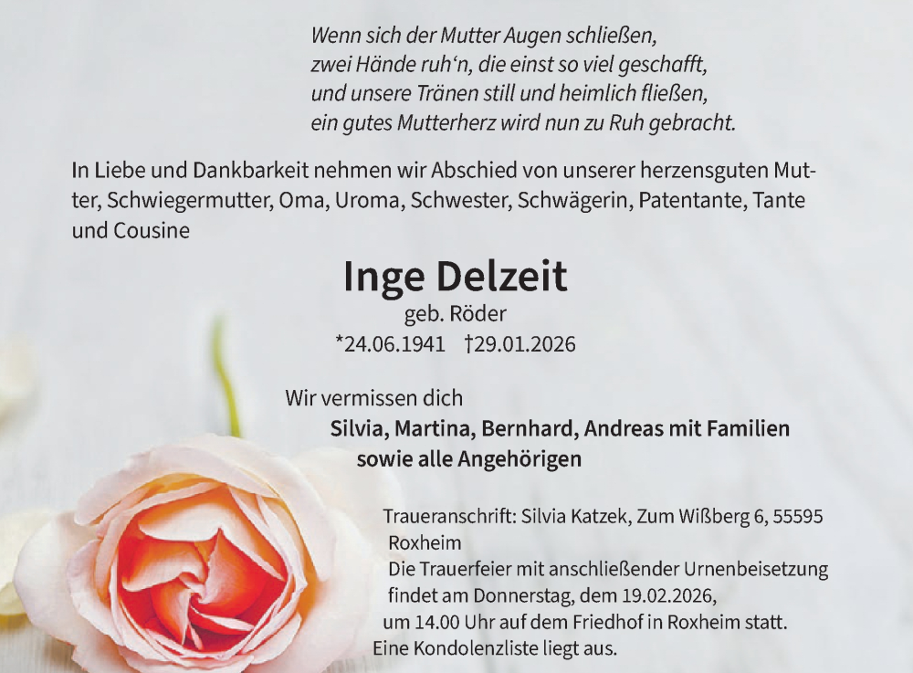 Hier finden Sie alle Traueranzeigen aus der Zeitung, die bisher für Inge Delzeit erschienen sind. Weitere Traueranzeigen, die in der Zeitung erscheinen, werden hier ebenfalls aufgelistet