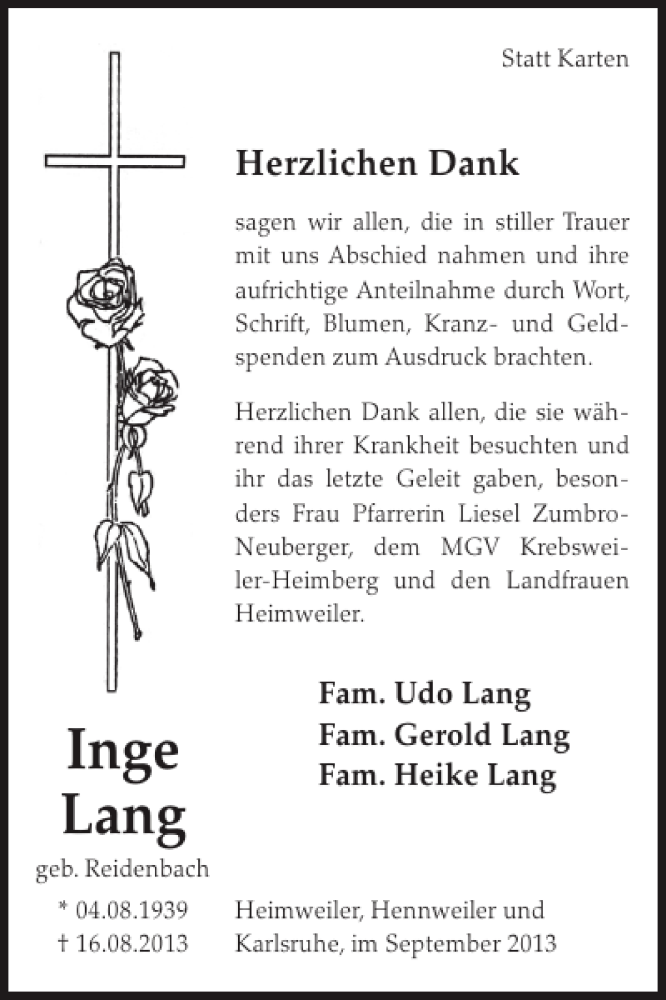 Hier finden Sie alle Traueranzeigen aus der Zeitung, die bisher für Inge Lang erschienen sind. Weitere Traueranzeigen, die in der Zeitung erscheinen, werden hier ebenfalls aufgelistet