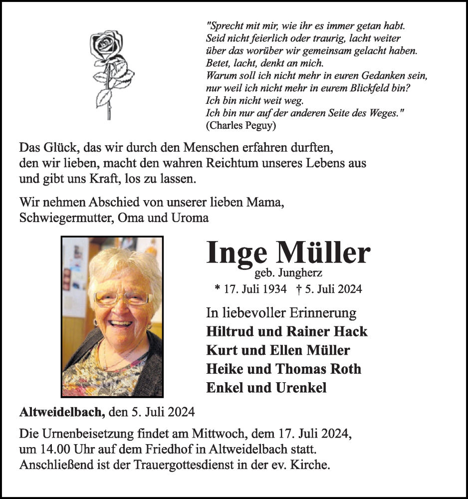 Hier finden Sie alle Traueranzeigen aus der Zeitung, die bisher für Inge Müller erschienen sind. Weitere Traueranzeigen, die in der Zeitung erscheinen, werden hier ebenfalls aufgelistet