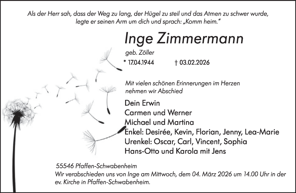 Hier finden Sie alle Traueranzeigen aus der Zeitung, die bisher für Inge Zimmermann erschienen sind. Weitere Traueranzeigen, die in der Zeitung erscheinen, werden hier ebenfalls aufgelistet