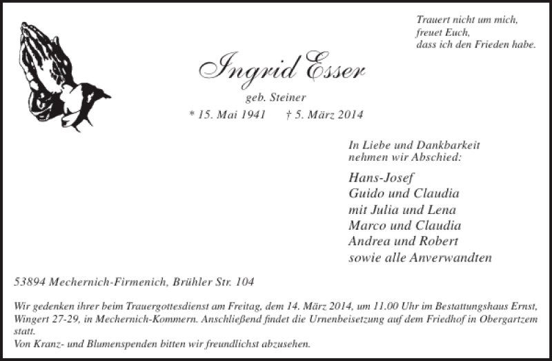 Hier finden Sie alle Traueranzeigen aus der Zeitung, die bisher für Ingrid Esser erschienen sind. Weitere Traueranzeigen, die in der Zeitung erscheinen, werden hier ebenfalls aufgelistet