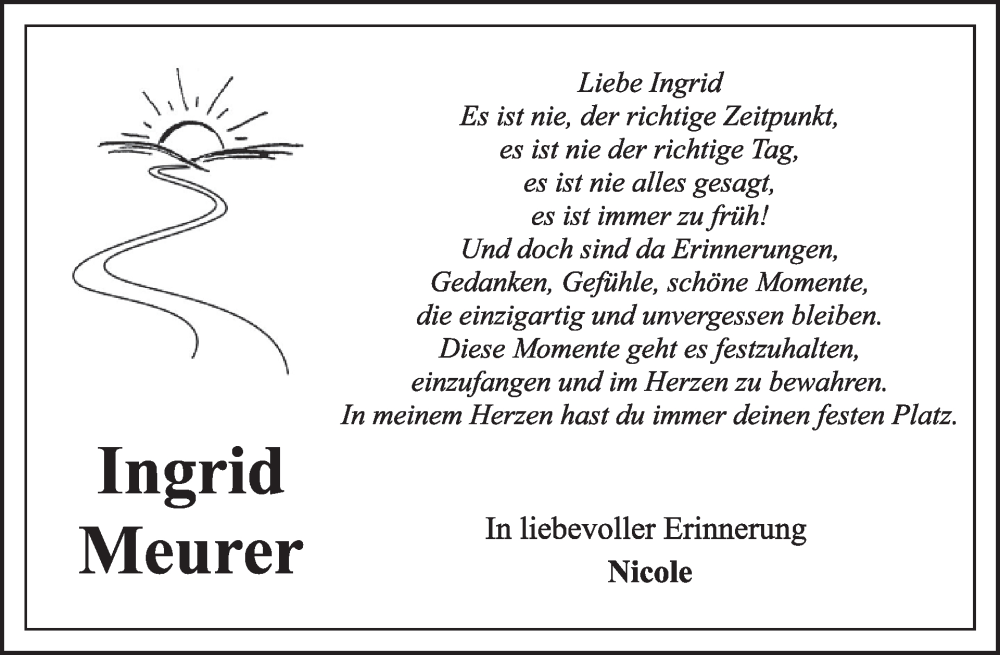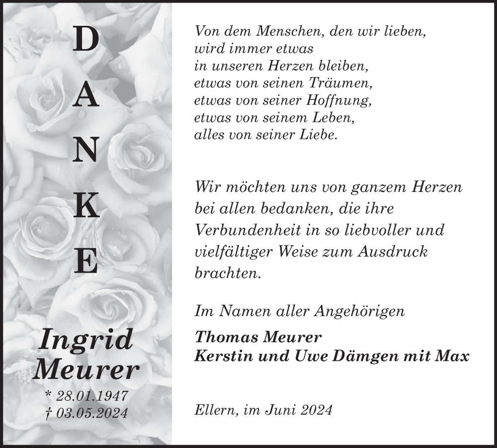 Hier finden Sie alle Traueranzeigen aus der Zeitung, die bisher für Ingrid Meurer erschienen sind. Weitere Traueranzeigen, die in der Zeitung erscheinen, werden hier ebenfalls aufgelistet