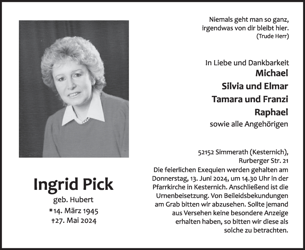 Hier finden Sie alle Traueranzeigen aus der Zeitung, die bisher für Ingrid Pick erschienen sind. Weitere Traueranzeigen, die in der Zeitung erscheinen, werden hier ebenfalls aufgelistet