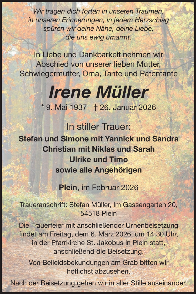 Hier finden Sie alle Traueranzeigen aus der Zeitung, die bisher für Irene Müller erschienen sind. Weitere Traueranzeigen, die in der Zeitung erscheinen, werden hier ebenfalls aufgelistet