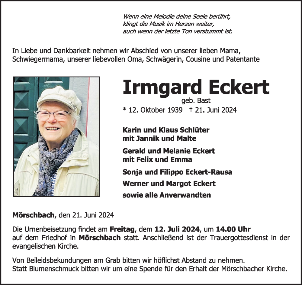 Hier finden Sie alle Traueranzeigen aus der Zeitung, die bisher für Irmgard Eckert erschienen sind. Weitere Traueranzeigen, die in der Zeitung erscheinen, werden hier ebenfalls aufgelistet