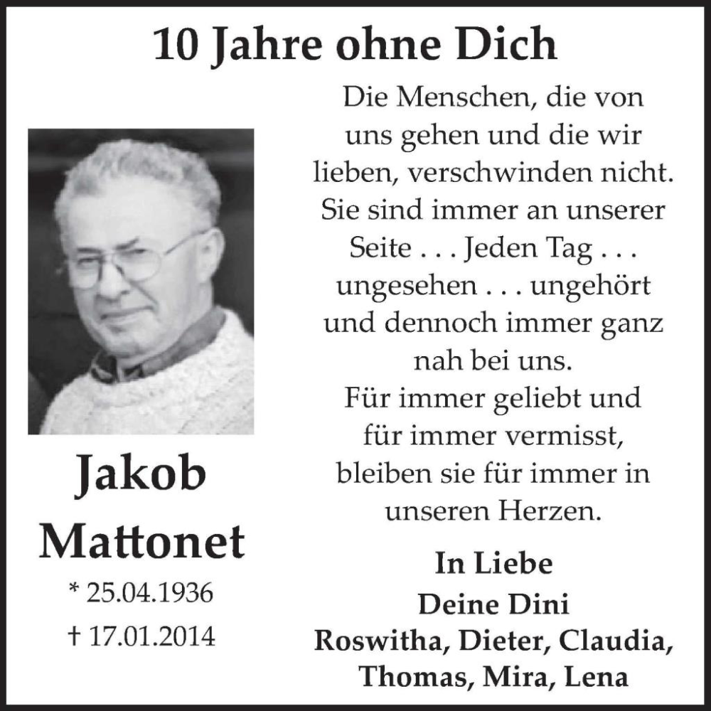 Hier finden Sie alle Traueranzeigen aus der Zeitung, die bisher für Jakob Mattonet erschienen sind. Weitere Traueranzeigen, die in der Zeitung erscheinen, werden hier ebenfalls aufgelistet