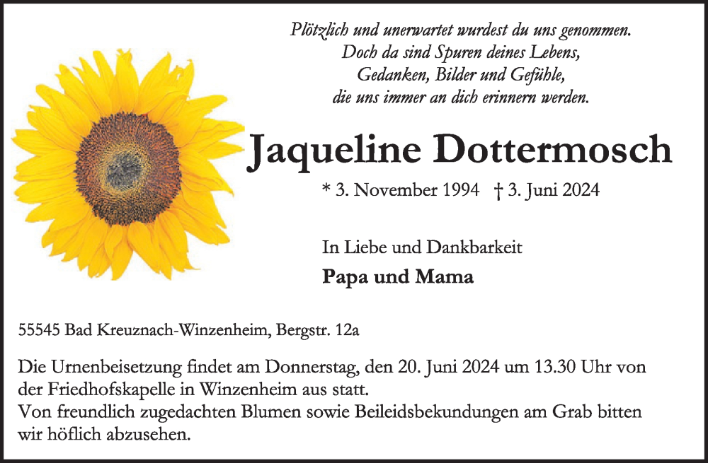 Hier finden Sie alle Traueranzeigen aus der Zeitung, die bisher für Jaqueline Dottermosch erschienen sind. Weitere Traueranzeigen, die in der Zeitung erscheinen, werden hier ebenfalls aufgelistet