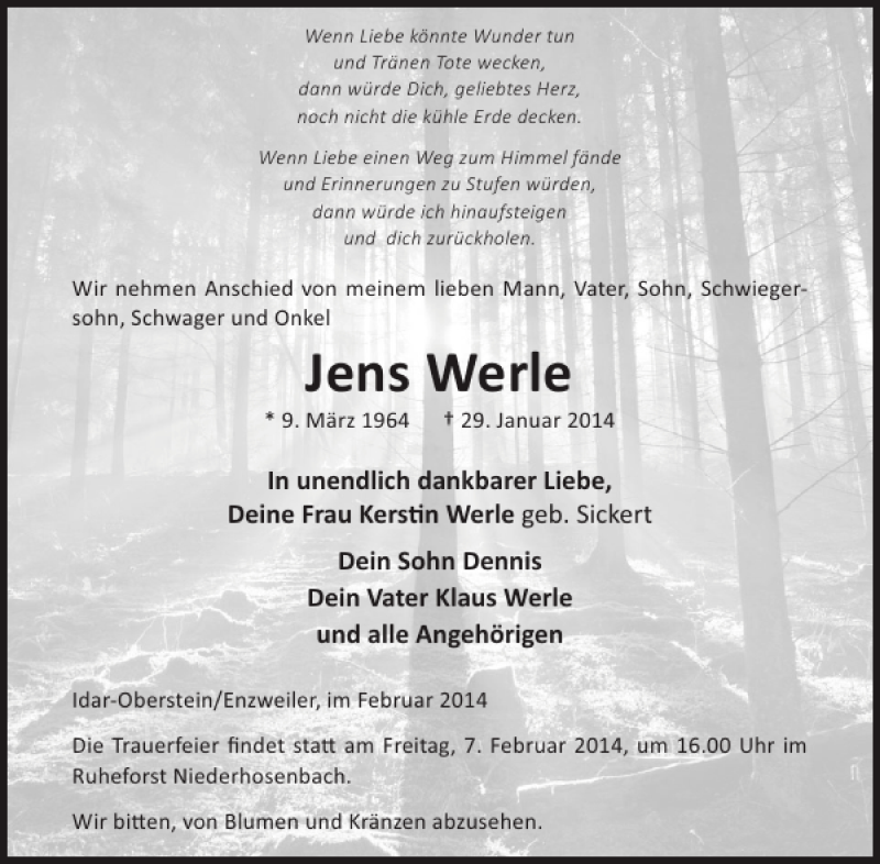 Hier finden Sie alle Traueranzeigen aus der Zeitung, die bisher für Jens Werle erschienen sind. Weitere Traueranzeigen, die in der Zeitung erscheinen, werden hier ebenfalls aufgelistet