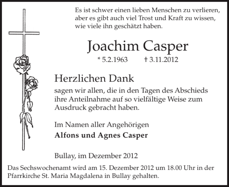 Hier finden Sie alle Traueranzeigen aus der Zeitung, die bisher für Joachim Casper erschienen sind. Weitere Traueranzeigen, die in der Zeitung erscheinen, werden hier ebenfalls aufgelistet
