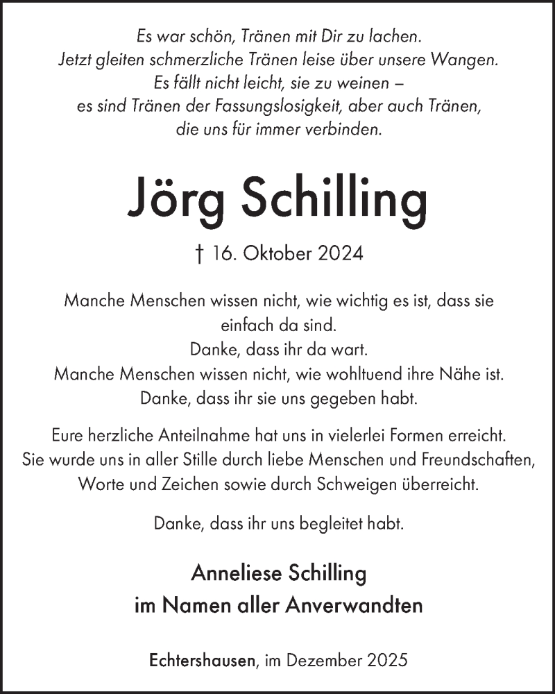 Hier finden Sie alle Traueranzeigen aus der Zeitung, die bisher für Jörg Schilling erschienen sind. Weitere Traueranzeigen, die in der Zeitung erscheinen, werden hier ebenfalls aufgelistet