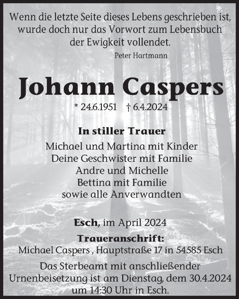 Hier finden Sie alle Traueranzeigen aus der Zeitung, die bisher für Johann Caspers erschienen sind. Weitere Traueranzeigen, die in der Zeitung erscheinen, werden hier ebenfalls aufgelistet