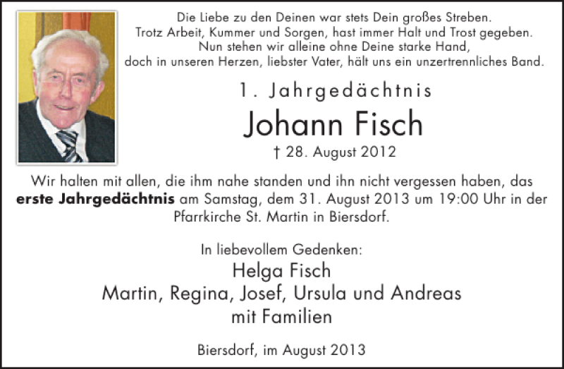 Hier finden Sie alle Traueranzeigen aus der Zeitung, die bisher für Johann Fisch erschienen sind. Weitere Traueranzeigen, die in der Zeitung erscheinen, werden hier ebenfalls aufgelistet