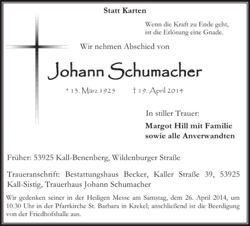 Hier finden Sie alle Traueranzeigen aus der Zeitung, die bisher für Johann Schumacher erschienen sind. Weitere Traueranzeigen, die in der Zeitung erscheinen, werden hier ebenfalls aufgelistet