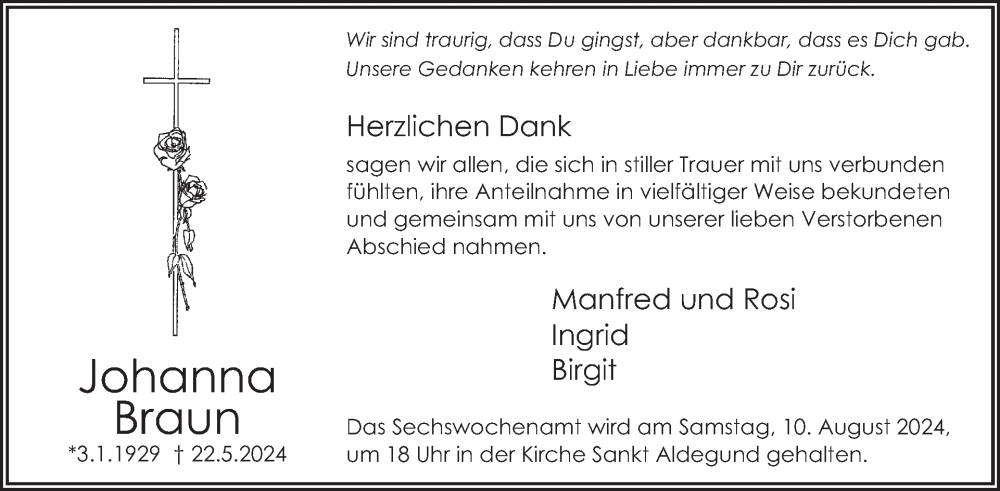 Hier finden Sie alle Traueranzeigen aus der Zeitung, die bisher für Johanna Braun erschienen sind. Weitere Traueranzeigen, die in der Zeitung erscheinen, werden hier ebenfalls aufgelistet