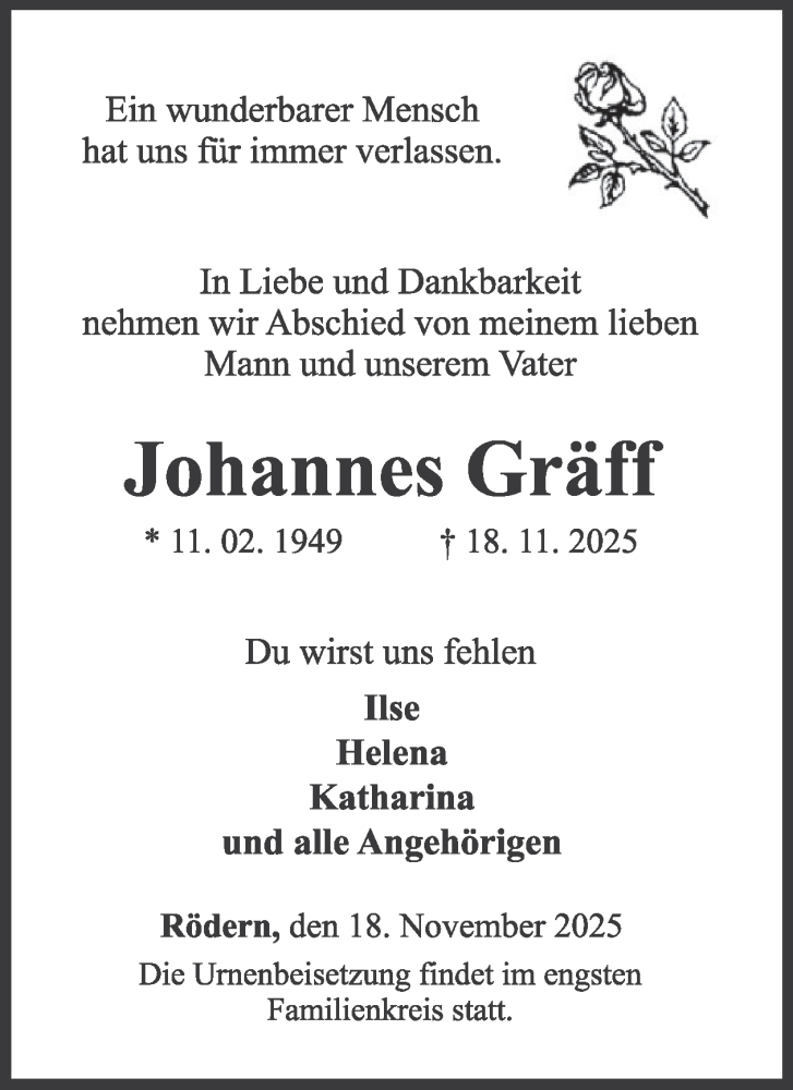 Hier finden Sie alle Traueranzeigen aus der Zeitung, die bisher für Johannes Gräff erschienen sind. Weitere Traueranzeigen, die in der Zeitung erscheinen, werden hier ebenfalls aufgelistet