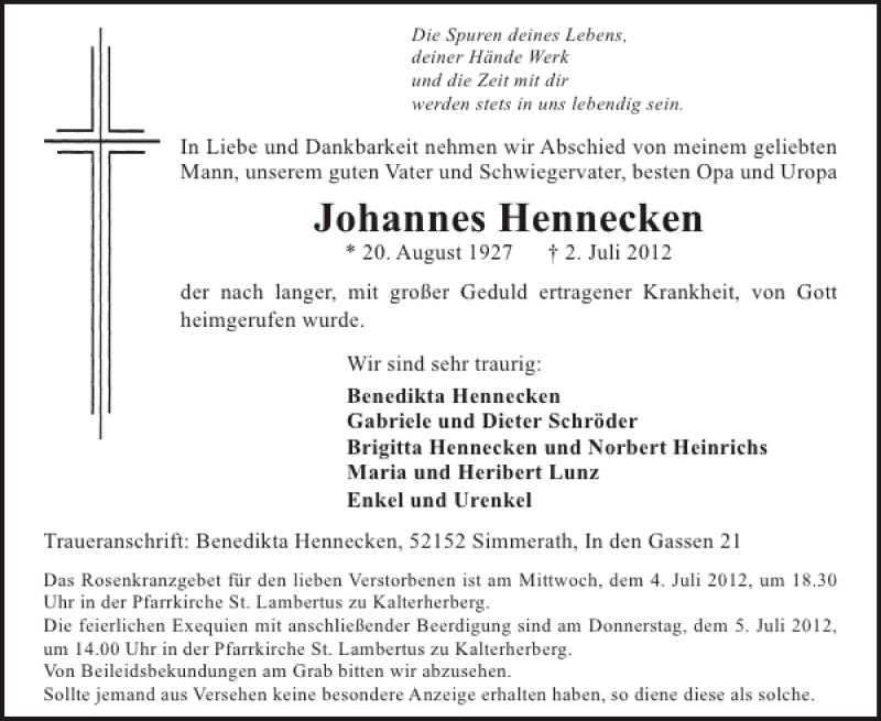 Hier finden Sie alle Traueranzeigen aus der Zeitung, die bisher für Johannes Hennecken erschienen sind. Weitere Traueranzeigen, die in der Zeitung erscheinen, werden hier ebenfalls aufgelistet