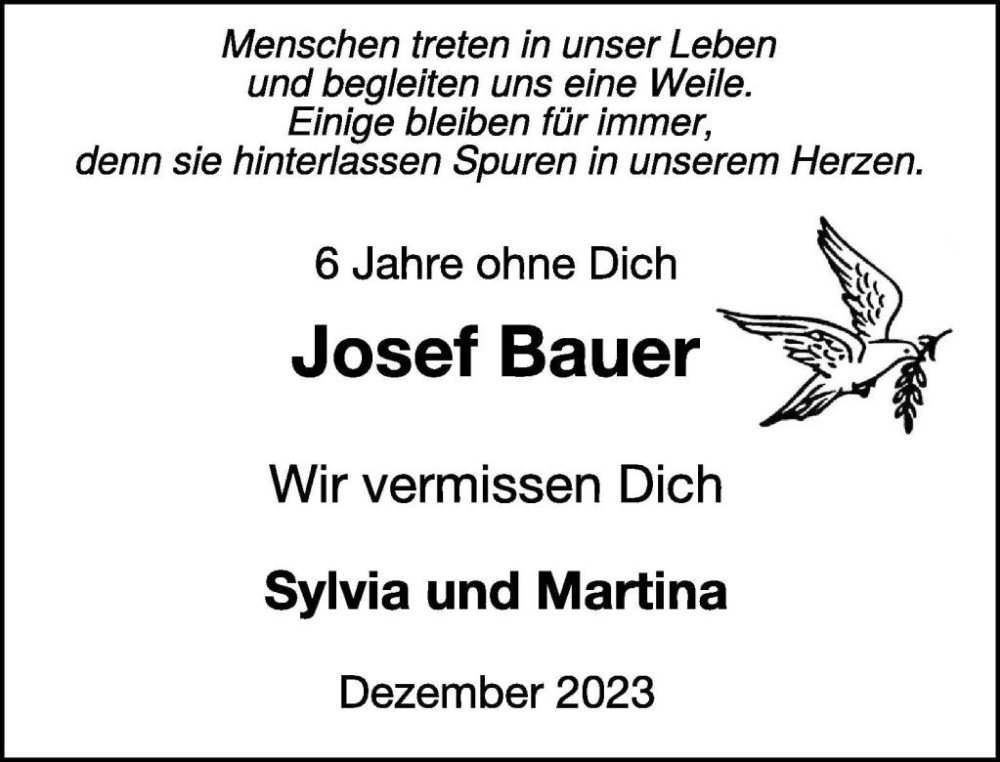 Hier finden Sie alle Traueranzeigen aus der Zeitung, die bisher für Josef Bauer erschienen sind. Weitere Traueranzeigen, die in der Zeitung erscheinen, werden hier ebenfalls aufgelistet