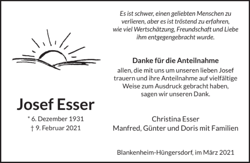 Hier finden Sie alle Traueranzeigen aus der Zeitung, die bisher für Josef Esser erschienen sind. Weitere Traueranzeigen, die in der Zeitung erscheinen, werden hier ebenfalls aufgelistet