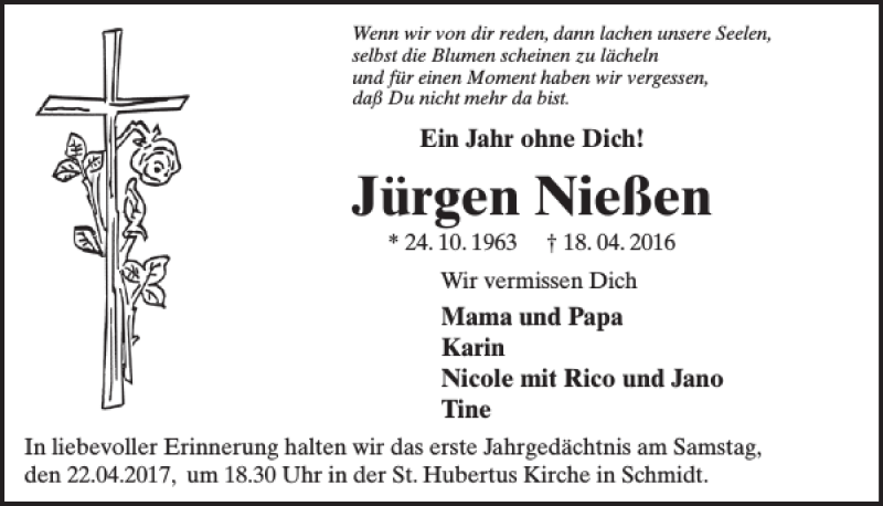 Hier finden Sie alle Traueranzeigen aus der Zeitung, die bisher für Jürgen Nießen erschienen sind. Weitere Traueranzeigen, die in der Zeitung erscheinen, werden hier ebenfalls aufgelistet