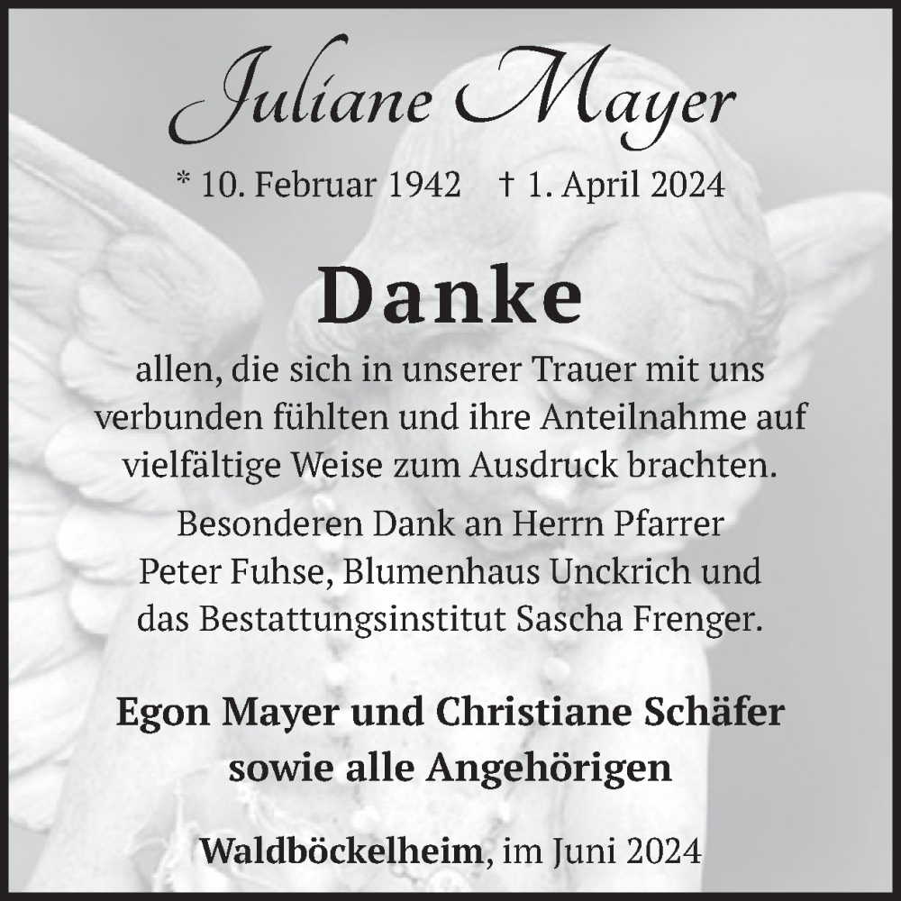 Hier finden Sie alle Traueranzeigen aus der Zeitung, die bisher für Juliane Mayer erschienen sind. Weitere Traueranzeigen, die in der Zeitung erscheinen, werden hier ebenfalls aufgelistet