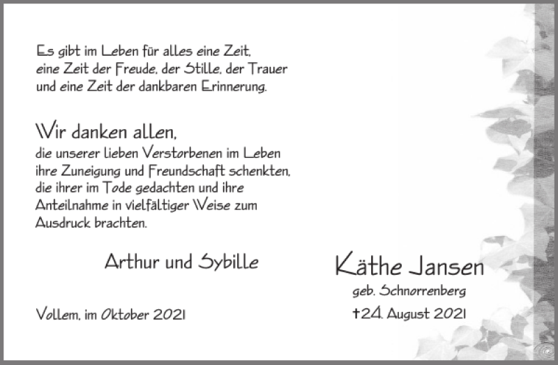 Hier finden Sie alle Traueranzeigen aus der Zeitung, die bisher für Käthe Jansen erschienen sind. Weitere Traueranzeigen, die in der Zeitung erscheinen, werden hier ebenfalls aufgelistet