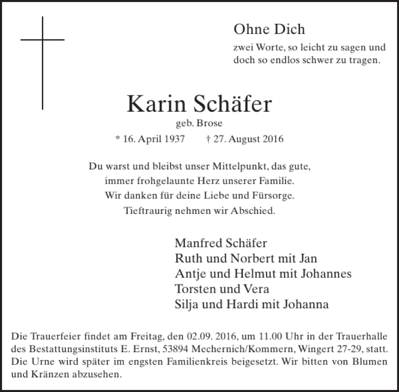 Hier finden Sie alle Traueranzeigen aus der Zeitung, die bisher für Karin Schäfer erschienen sind. Weitere Traueranzeigen, die in der Zeitung erscheinen, werden hier ebenfalls aufgelistet