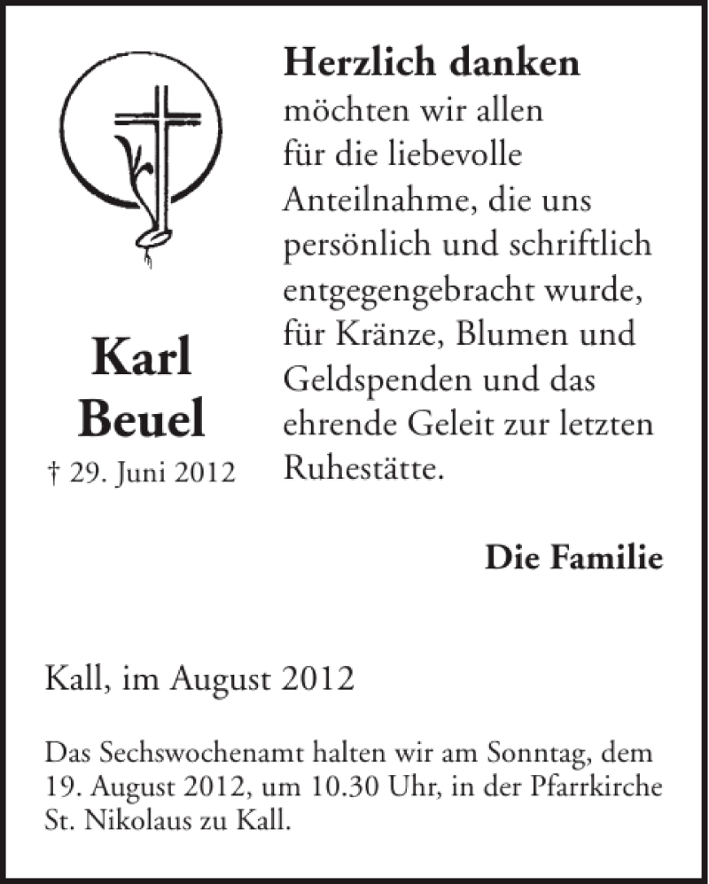 Hier finden Sie alle Traueranzeigen aus der Zeitung, die bisher für Karl Beuel erschienen sind. Weitere Traueranzeigen, die in der Zeitung erscheinen, werden hier ebenfalls aufgelistet