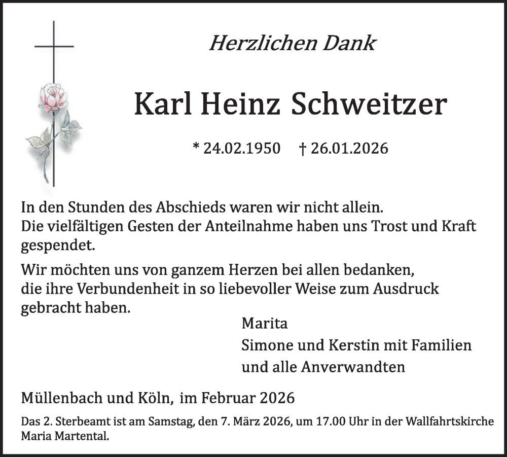 Hier finden Sie alle Traueranzeigen aus der Zeitung, die bisher für Karl Heinz Schweitzer erschienen sind. Weitere Traueranzeigen, die in der Zeitung erscheinen, werden hier ebenfalls aufgelistet