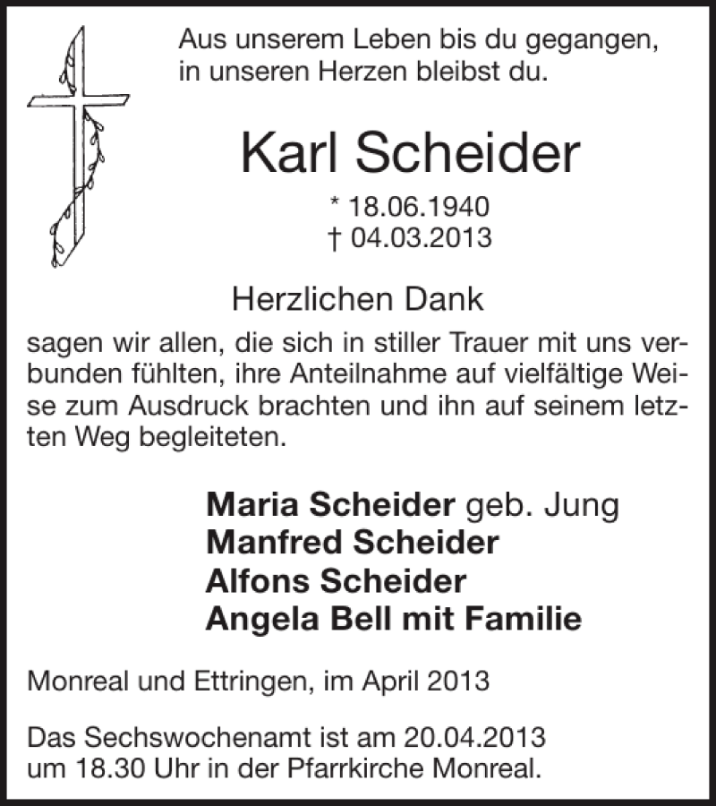 Hier finden Sie alle Traueranzeigen aus der Zeitung, die bisher für Karl Scheider erschienen sind. Weitere Traueranzeigen, die in der Zeitung erscheinen, werden hier ebenfalls aufgelistet