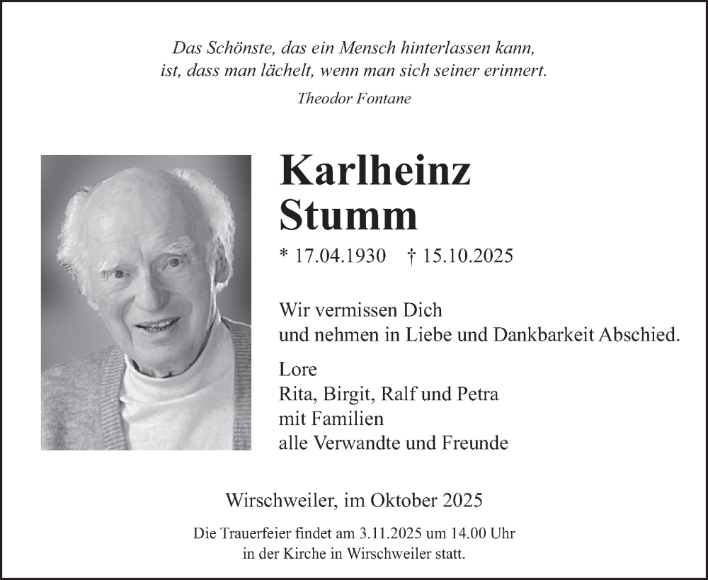 Hier finden Sie alle Traueranzeigen aus der Zeitung, die bisher für Karlheinz Stumm erschienen sind. Weitere Traueranzeigen, die in der Zeitung erscheinen, werden hier ebenfalls aufgelistet