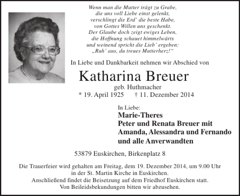 Hier finden Sie alle Traueranzeigen aus der Zeitung, die bisher für Katharina Breuer erschienen sind. Weitere Traueranzeigen, die in der Zeitung erscheinen, werden hier ebenfalls aufgelistet