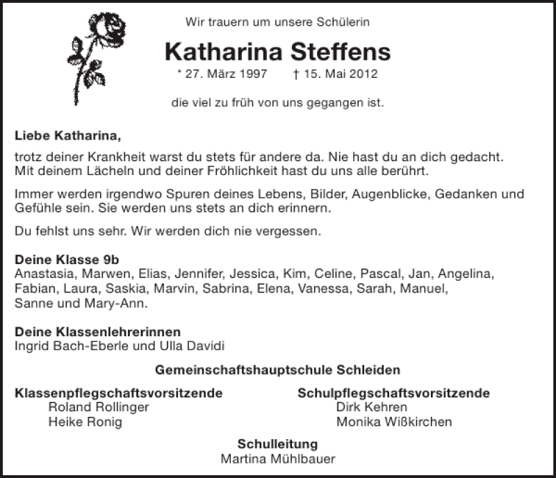 Hier finden Sie alle Traueranzeigen aus der Zeitung, die bisher für Katharina Steffens erschienen sind. Weitere Traueranzeigen, die in der Zeitung erscheinen, werden hier ebenfalls aufgelistet