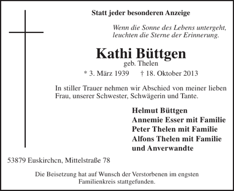 Hier finden Sie alle Traueranzeigen aus der Zeitung, die bisher für Kathi Büttgen erschienen sind. Weitere Traueranzeigen, die in der Zeitung erscheinen, werden hier ebenfalls aufgelistet