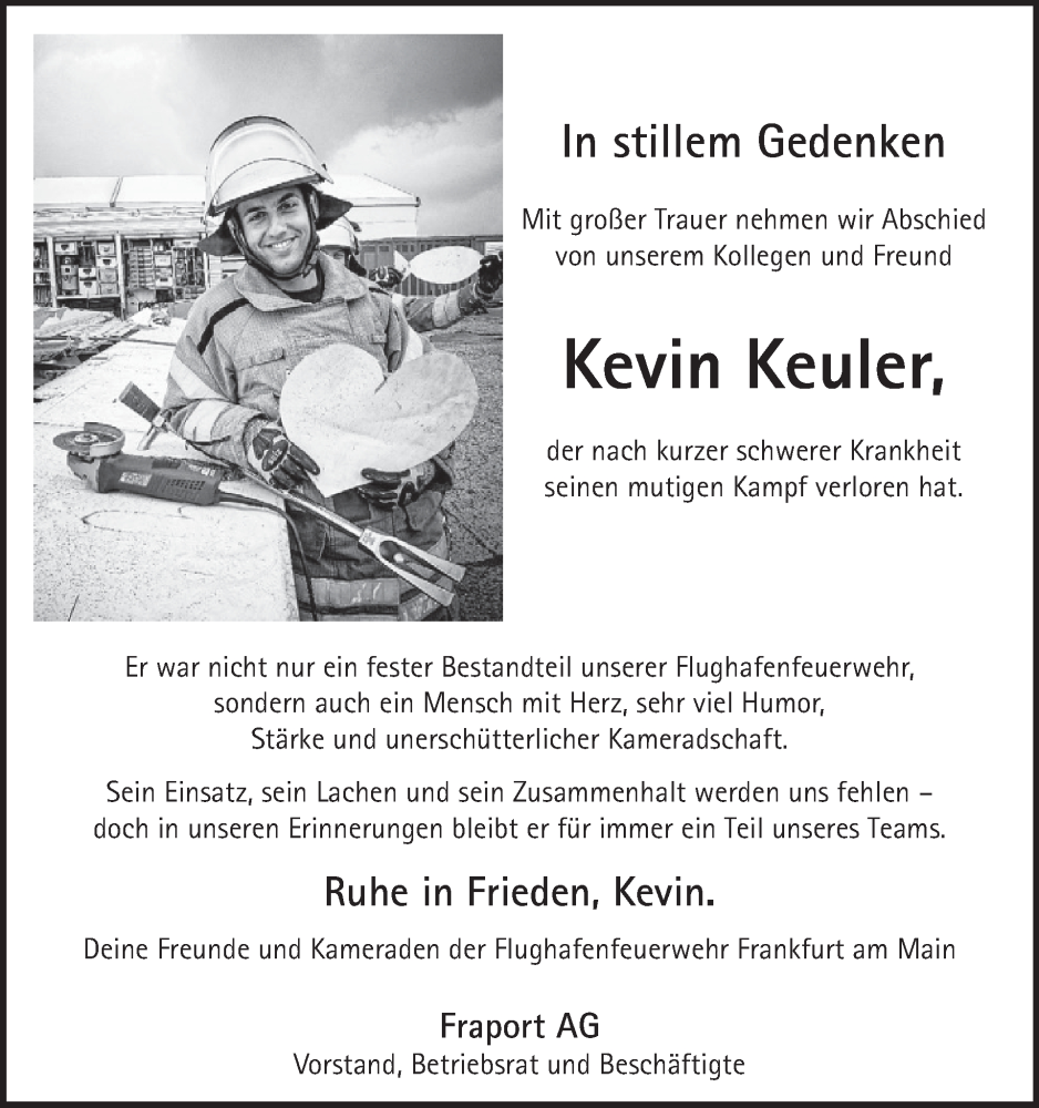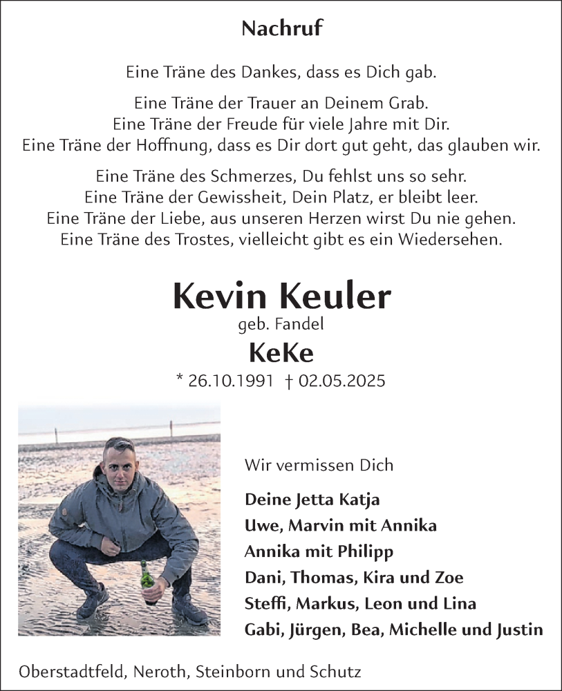 Hier finden Sie alle Traueranzeigen aus der Zeitung, die bisher für Kevin Keuler erschienen sind. Weitere Traueranzeigen, die in der Zeitung erscheinen, werden hier ebenfalls aufgelistet