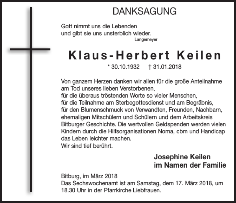 Hier finden Sie alle Traueranzeigen aus der Zeitung, die bisher für Klaus-Herbert Keilen erschienen sind. Weitere Traueranzeigen, die in der Zeitung erscheinen, werden hier ebenfalls aufgelistet