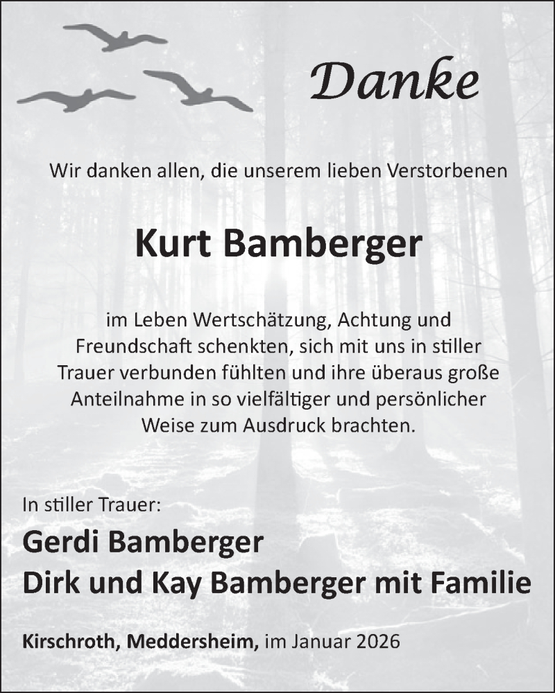 Hier finden Sie alle Traueranzeigen aus der Zeitung, die bisher für Kurt Bamberger erschienen sind. Weitere Traueranzeigen, die in der Zeitung erscheinen, werden hier ebenfalls aufgelistet