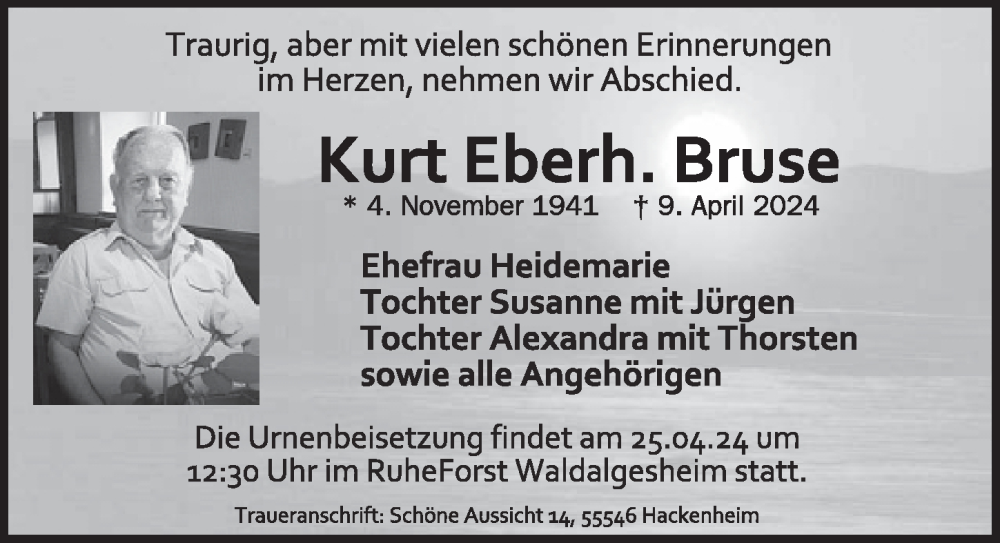 Hier finden Sie alle Traueranzeigen aus der Zeitung, die bisher für Kurt Eberh. Bruse erschienen sind. Weitere Traueranzeigen, die in der Zeitung erscheinen, werden hier ebenfalls aufgelistet